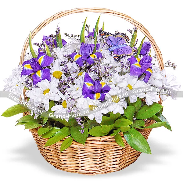 Стандартный: ирисы - 7 шт., хризантема белая ромашковая - 6 шт., декоративная зелень, декор(бабочка), оазис, корзина средня.
