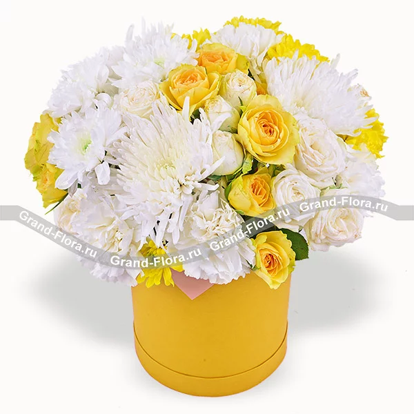 Стандартный: хризантема одноголовая белая - 3 шт., хризантема кустовая белая - 2 шт., гвоздика белая - 4 шт., роза кустовая белая - 2 шт., роза кустовая желтая - 2 шт., хризантема кустовая желтая - 2 шт., оазис, коробка. Примерный размер: 25Х30 см.