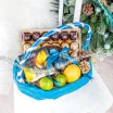 Стандартный(на фото): чай "Curtis"- 20 пак., конфеты "Ferrerro Roсher" - 269 г., лайм - 5 шт., лимон - 2 шт., шишки - 3 шт., шарики - 2 шт., корзина средняя.